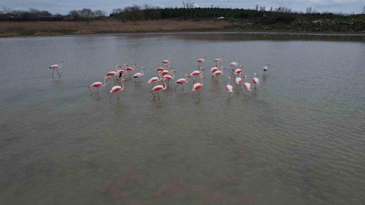 İstanbul'da bulunan Büyükçekmece Gölü, bu kez flamingolara ev sahipliği yaptı. Göl üzerinde süzülen flamingolar, havadan görüntülendi.