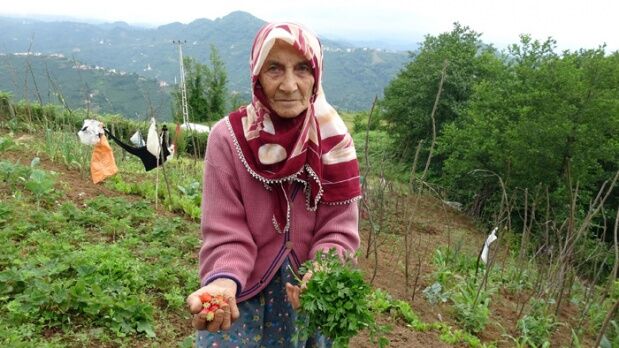 Çarşıbaşı ilçesinde oturan Ayşe Uslu, 43 yıl önce eşini kaybetti, oğlu ile yaşamaya başladı. Herhangi bir geliri olmayan Uslu, 30 yıldır bahçesinde sebze yetiştirip, büyükbaş hayvanlardan sağdığı sütten de peynir ve tereyağı yapıyor.