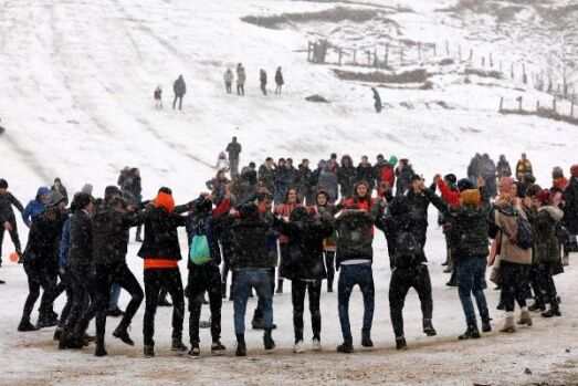 RİZE'nin Çamlıhemşin ilçesindeki ünlü turizm merkezi Ayder Yaylası'nda kar yağışı altında horon oynayan tatilciler, eğlenceli anlar yaşadı.