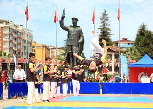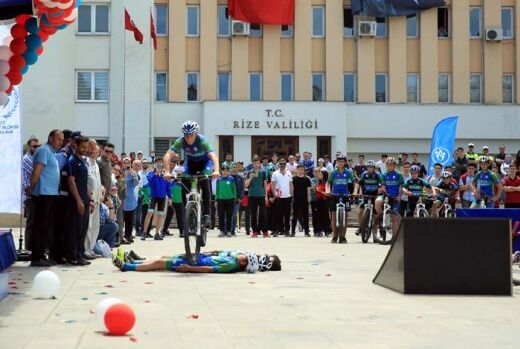 Dağcılık kulübü sporcuları Rize Valilik binasının çatısından ellerindeki Türk bayrağı ile yere inerek bayrağı Rize Valisi Erdoğan Bektaş’a teslim etti. Vali Bektaş, ay yıldızlı bayrağı öperek aldı. Halk oyunları ekibinin gösterilerinin ardından gösteri yapan Capoeira sporcusu Mesut Kurtuluş sakatlandı. Sporcu antrenörlerinin yardımıyla minderin dışına çıkarıldı.
