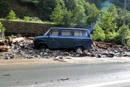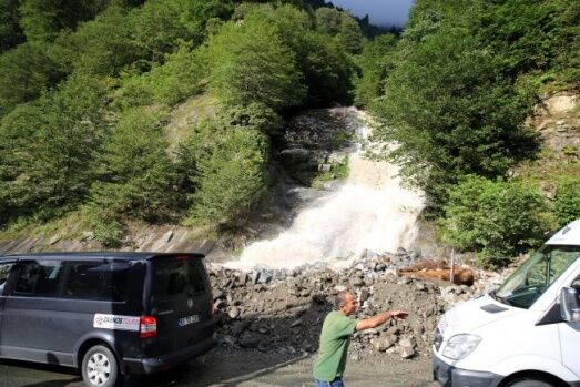 Sel ve heyelan nedeniyle yolda kalan bir minibüste de hasar oluştu. Yağışın etkisiyle Fırtına Deresi’nin debisi de yükselirken, Çat Vadisi-Zil Kale yolu da dere taşması sonucu ulaşıma kapandı.