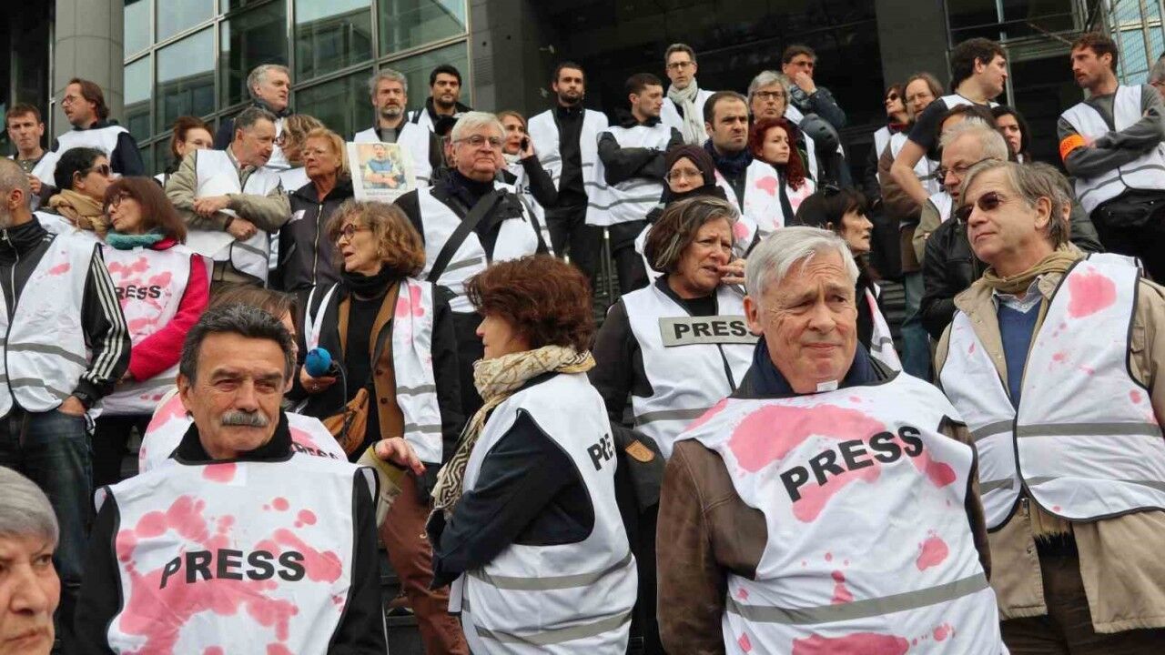 Fransa’da bir araya gelen gazeteciler, İsrail’in saldırıları sonucu Gazze Şeridi’nde hayatını kaybeden meslektaşlarını anarak, İsrail saldırılarını protesto etti.