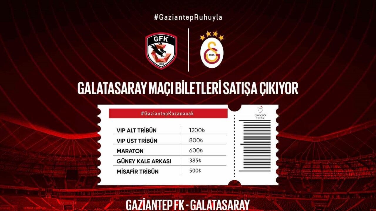 Gaziantep Futbol Kulübü, Trendyol Süper Lig’in 4. haftasında Galatasaray’ı konuk edecek. Gaziantep Kalyon Stadı’nda 2 Eylül Cumartesi günü saat 21.45’de oynanacak maçın biletleri satışa çıktı. Bilet fiyatları 385 ile bin 200 TL arasında değişirken, konuk Galatasaray taraftarlarına ayrılan misafir tribün bilet fiyatları ise 500 TL’den satışa sunuldu.