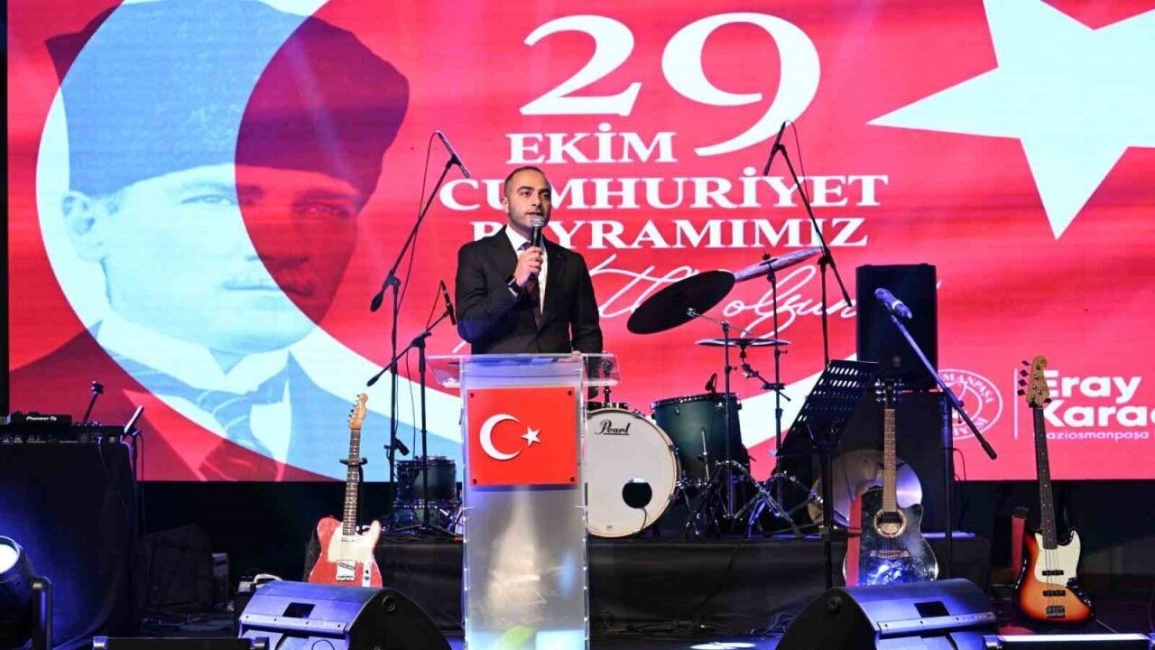 Gaziosmanpaşa Belediye Başkan Vekili Eray Karadeniz, "Bugün burada tarih sahnesinde eşsiz bir zafer olarak yazılmış, Cumhuriyetimizin 102. yıl dönümünü kutlamak için toplandık. Bu meydan, özgürlüğünü korumak için canını ortaya koyan atalarımızın mirasıdır. Bu topraklar, bağımsızlık uğruna verilen mücadelenin ve milletimizin kararlılığının sembolüdür. Cumhuriyet, binlerce yıllık devlet geleneğimizin en kudretli ve en kalıcı eseridir. Malazgirt’den Selçuklu ve Osmanlı’ya nihayet Gazi Mustafa Kemal Atatürk’ün önderliğinde kurulan Cumhuriyet’e uzanan yol, azim ve fedakarlıklarla yazılmıştır. İlçemiz, adıyla ve ruhuyla tarihimize ışık tutan bir yer. İsmini kahramanlığı ile tarihe yazan Gazi Osman Paşa’dan alıyor. Plevne’de sergilediği direniş, milletimizin bağımsızlık ve özgürlük iradesinin en somut göstergesidir. O kararlılık, o azim bugün bizlere yol gösteriyor. Bizler, Gaziosmanpaşa’da tıpkı Gazi Osman Paşa gibi zorluklar karşısında yılmayacak, ülkemizi ve milletimizi her türlü tehdide karşı koruyacağız. Bu millete hizmet etmeye devam edeceğiz inşallah. Bugün eksiklikleri birer birer tamamlayan Türkiye’yi muasır medeniyetlerin çok üzerine taşıyacak bir yolculuğun içindeyiz. Sayın Cumhurbaşkanımız Recep Tayyip Erdoğan’ın liderliğinde Türkiye Yüzyıl’ı vizyonuyla hayata geçirmek için kararlılıkla ilerlemeye devam ediyoruz. Milletimizin desteğiyle her zorluğu aşacak ve Cumhuriyetimizi daha da güçlendireceğiz. Bir kez daha haykırıyoruz. ‘Cumhuriyet bizimdir. Özgürlük bizimdir. Kararlılığımız sarsılmaz’" dedi.