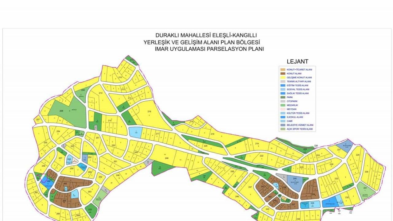 Belediyeden yapılan açıklamaya göre, Duraklı Mahallesi Eleşli ve Kangıllı mevkisindeki yerleşik ve gelişim alanlarını kapsayan 69 hektarlık bölgedeki planlama ve parselasyon çalışmaları sonuçlandırıldı. Mülkiyet sorunlarının çözüme kavuşturulduğu uygulama kapsamında bölgede 312 imar parseli oluşturulurken, 403 hak sahibi tapularını almaya hak kazandı.