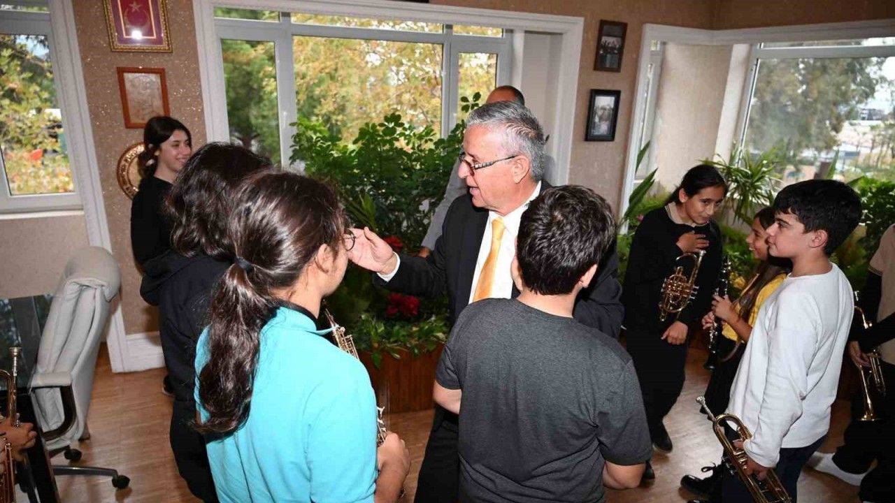 Kemer Belediyesi ATSO Eğitim ve Sanat Merkezi’nde ücretsiz müzik eğitimi alan Kemer Belediyesi Gençlik Orkestrası öğrencileri, Orkestra Şefi Furkan Üstündağ ile Öğretmenler Günü dolayısıyla Kemer Belediye Başkanı Necati Topaloğlu’nu ziyaret ederek gününü kutladı.