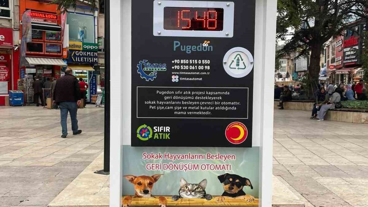 Sokak hayvanlarına mama katkısı sağlayacak proje çerçevesinde Kuzeykent ve Nasrullah Meydanı’na kurulumu sağlanan ve güneş enerjisiyle çalışan ‘Atık-Matikler’ atılan her geri dönüşüm malzemesi için 30-40 gram mama verecek.