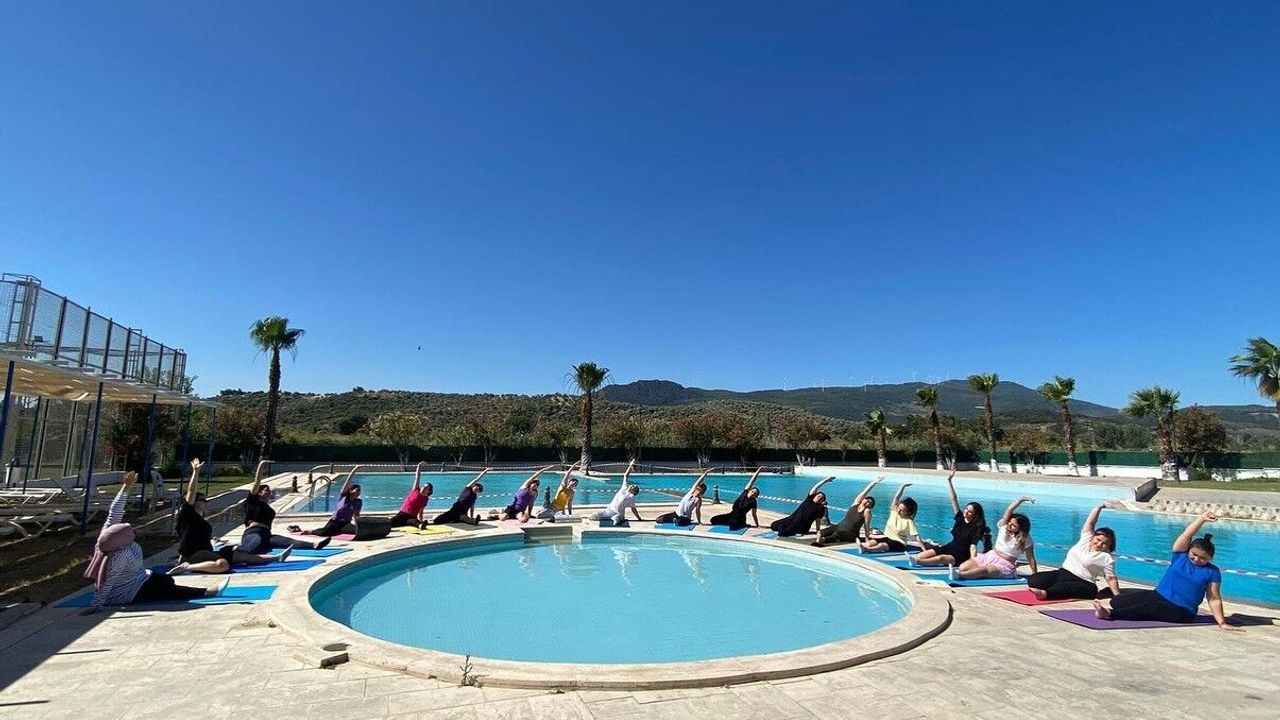 Germencik Belediyesi tarafından düzenlenen yoga, pilates ve zumba kurslarına yoğun ilgi gösteren kadınlar, uzman eğitmenler eşliğinde havuz başında spor yapma imkanı buluyor.