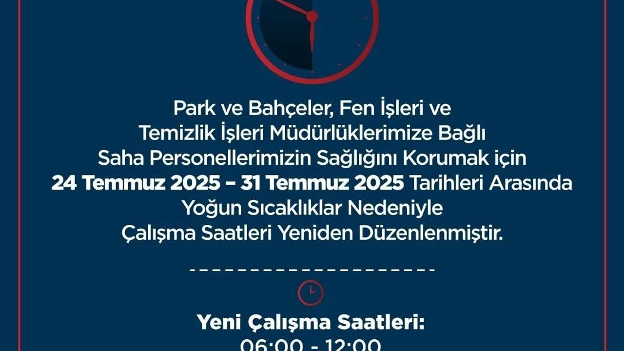 Park Bahçeler, Fen İşleri ve Temizlik İşleri Müdürlükleri’ne bağlı saha personellerini kapsayan düzenleme kapsamında çalışma saatleri 24-31 Temmuz 2025 tarihleri arasında 06.00-12.00 olarak belirlendi. Başkan Zencirci açıklamasında, "Aşırı sıcaklar sebebiyle sahada görevli çalışma arkadaşlarımızın sağlığını korumak için belirli bir süre için çalışma saatlerini günün daha serin vakitlerine göre ayarladık. Belirtilen tarihler arasında personellerimiz günlük 6 saat çalışacaktır. İyi çalışmalar dilerim" ifadelerine yer verdi.