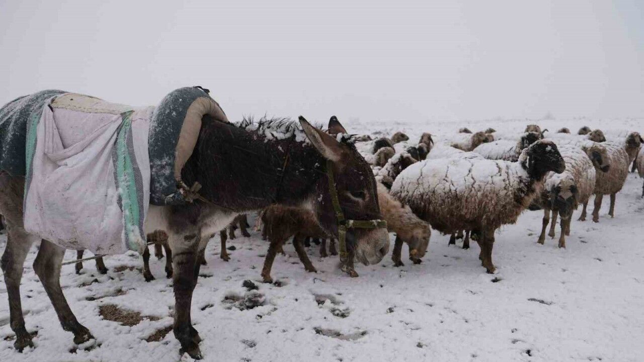 Yem fiyatlarının artmasından dolayı hayvanlarını henüz kışlık bölgelere indiremeyen üreticiler, kar altında hayvanlarını otlatmaya devam ediyor. Kar yağışı, üreticilerin günlük yaşamını da olumsuz etkilerken, çadırlarda zorlu yaşam koşulları göze çarpıyor.