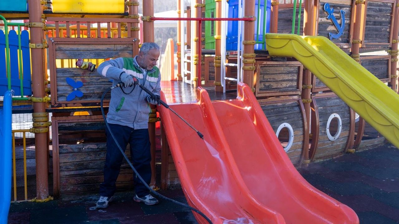 Havaların ısınmasıyla birlikte vatandaşların özellikle çocuklarıyla birlikte vakit geçirdiği park ve yeşil alanlarda temizlik çalışmaları hız kazandı. Gölbaşı Belediyesi ekipleri, ilçedeki parkları daha temiz ve güvenli hale getirmek için kapsamlı bir çalışma başlattı. Bu kapsamda Alparslan Türkeş Parkı ve Atatürk Sahil Park'ta bulunan oyun grupları ile park alanları belediye ekipleri tarafından detaylı şekilde temizlendi. Oyun grupları tazyikli suyla yıkanarak hijyenik hale getirilirken, park içerisindeki yürüyüş yolları ve ortak kullanım alanları süpürge ve üfleme makineleriyle temizlendi. Temizlik çalışmalarının yanı sıra ilçedeki birçok parkta çocuk oyun grupları da yenilenerek daha güvenli ve modern hale getirildi. Çocukların güvenle oyun oynayabileceği alanlar oluşturulurken, ailelerin de daha temiz ve düzenli ortamlarda vakit geçirebilmesi hedefleniyor.