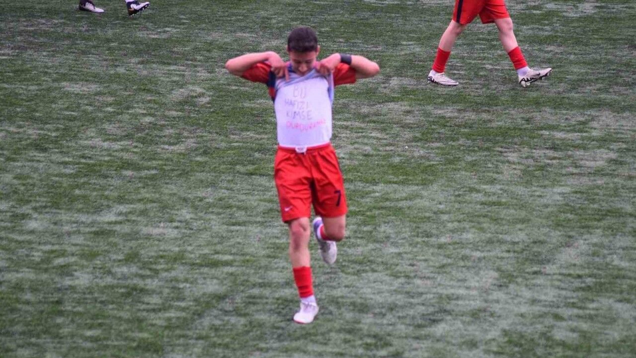 Zonguldak’ta amatör futbolcu ve aynı zamanda hafızlık öğrencisi olan Tarık Selman Erik (15), attığı 2 gol sonrasında sevincini formasının altındaki ’Bu hafızı kimse durduramaz’ yazısının bulunduğu tişörtü açarak kutladı.