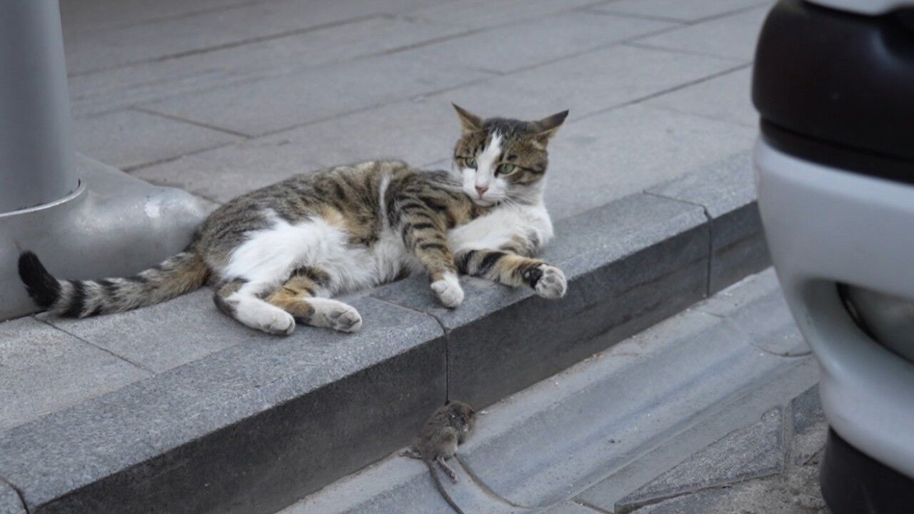 Cumhuriyet Caddesi üzerindeki bir iş yerinin önünde kaydedilen görüntülerde kedinin yakaladığı fareyi hemen öldürmek yerine bir süre serbest bırakarak yeniden yakaladığı görüldü. Doğal av içgüdüsüyle hareket eden kedinin o anları kameralara yansıdı. Fareyi havaya fırlatarak bir süre oynayan kedi, daha sonra sıkılarak fareyi bıraktı.