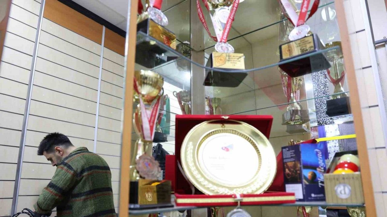 Elazığ’da terzilik yapan Lokman Korucu, bilardoda Türkiye ikinciliği ve birçok il birinciliği elde etti. Dükkandaki kupalar müşterileri hem şaşırtıyor hem de başarısını gösteriyor.