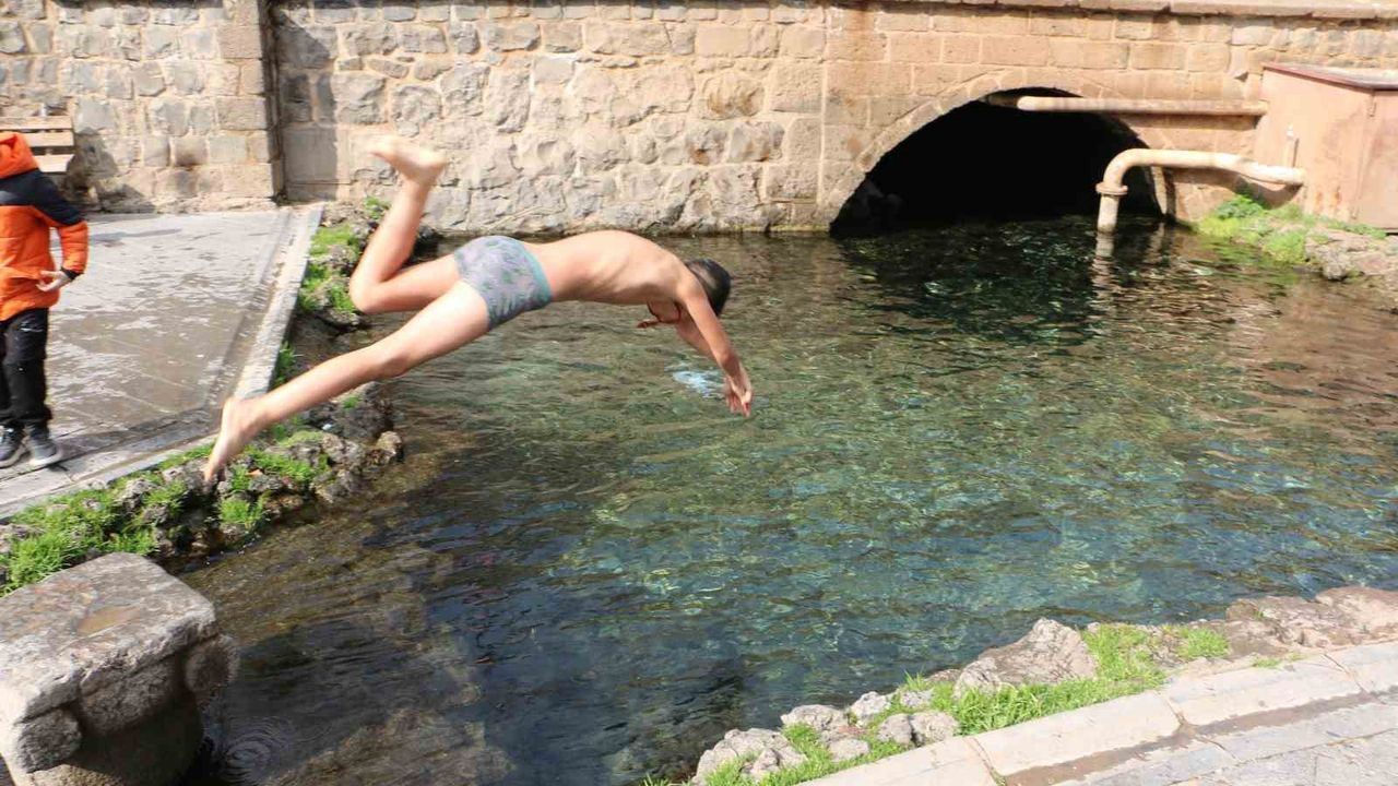 Diyarbakır'da hava sıcaklığının 7-8 dereceye kadar yükselmesini fırsat bilen çocuklar, Sur ilçesindeki tarihi Anzele Parkı'nda bulunan süs havuzuna akın etti. Kış ortasında yüzmenin keyfini çıkaran çocuklar doyasıya eğlenirken, mont ve bereleriyle çevrede bulunan vatandaşlar bu manzarayı şaşkınlıkla izledi.