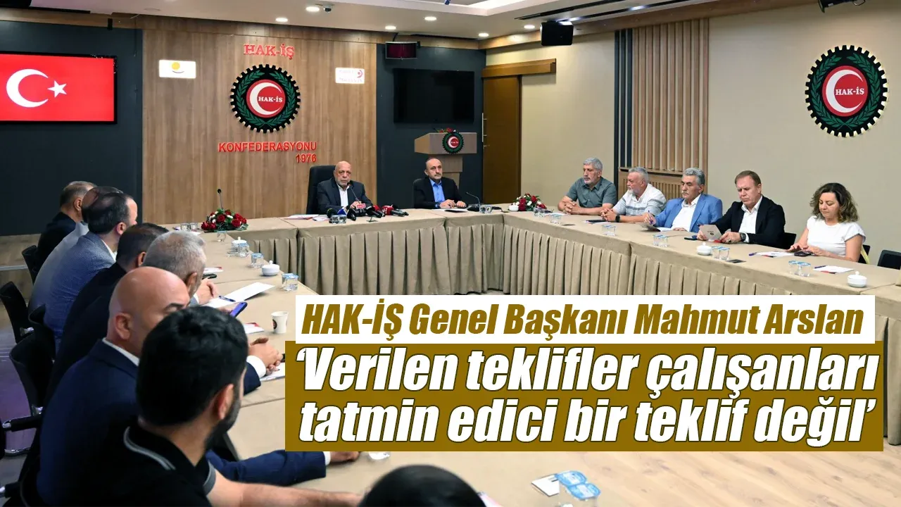 Hak İşçi Sendikaları Konfederasyonu (HAK-İŞ) Genel Başkanı Mahmut Arslan, Toplu İş Sözleşmeleri sürecine ilişkin basın toplantısı düzenledi. Verilen tekliflerin çalışanları tatmin edici bir teklif olmadığını ifade eden Arslan, "Biz toplu iş sözleşmesi sürecini havada olan uçak olarak değerlendiriyoruz" dedi.