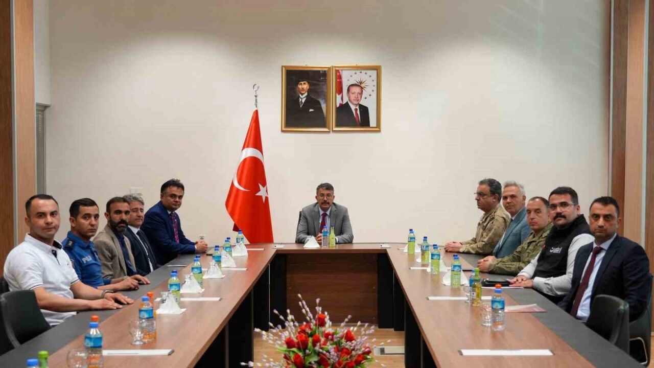 Hakkari Valisi Ali Çelik’in başkanlığında Göç İdaresi Başkanlığı Sınır Yönetimi Genel Müdürü Ozan Gazel, Yüksekova Kaymakamı Mustafa Akın, İl Jandarma Komutanı Tuğgeneral Necip Çarıkcıoğlu, Otluca Dağ ve Komando Tugay Komutanı Tuğgeneral Ufuk Hilmi Orhan, İl Göç İdaresi Müdürü Aykut Alptekin, Esendere Gümrük Müdür Vekili Mutasım Taş ve ilgili birim temsilcileri ile birlikte Esendere Gümrük Müdürlüğü’nde düzenlenen toplantıda, sınır kapısında yürütülen çalışmalar ve hizmetler ele alındı. Toplantıda, gümrük müdürlüğü bünyesinde sürdürülen faaliyetler hakkında bilgi alan Vali Çelik, personelin karşılaştığı sorunlar ve ihtiyaçlar konusunda da değerlendirmelerde bulundu. İlgili birimlerin taleplerini dinleyen Vali Çelik, hizmetlerin daha etkin ve verimli yürütülmesi için gereken hususlarda istişarelerde bulundu. Toplantının ardından katılımcılara teşekkür eden Vali Ali Çelik, tüm ekibe çalışmalarında başarılar diledi.