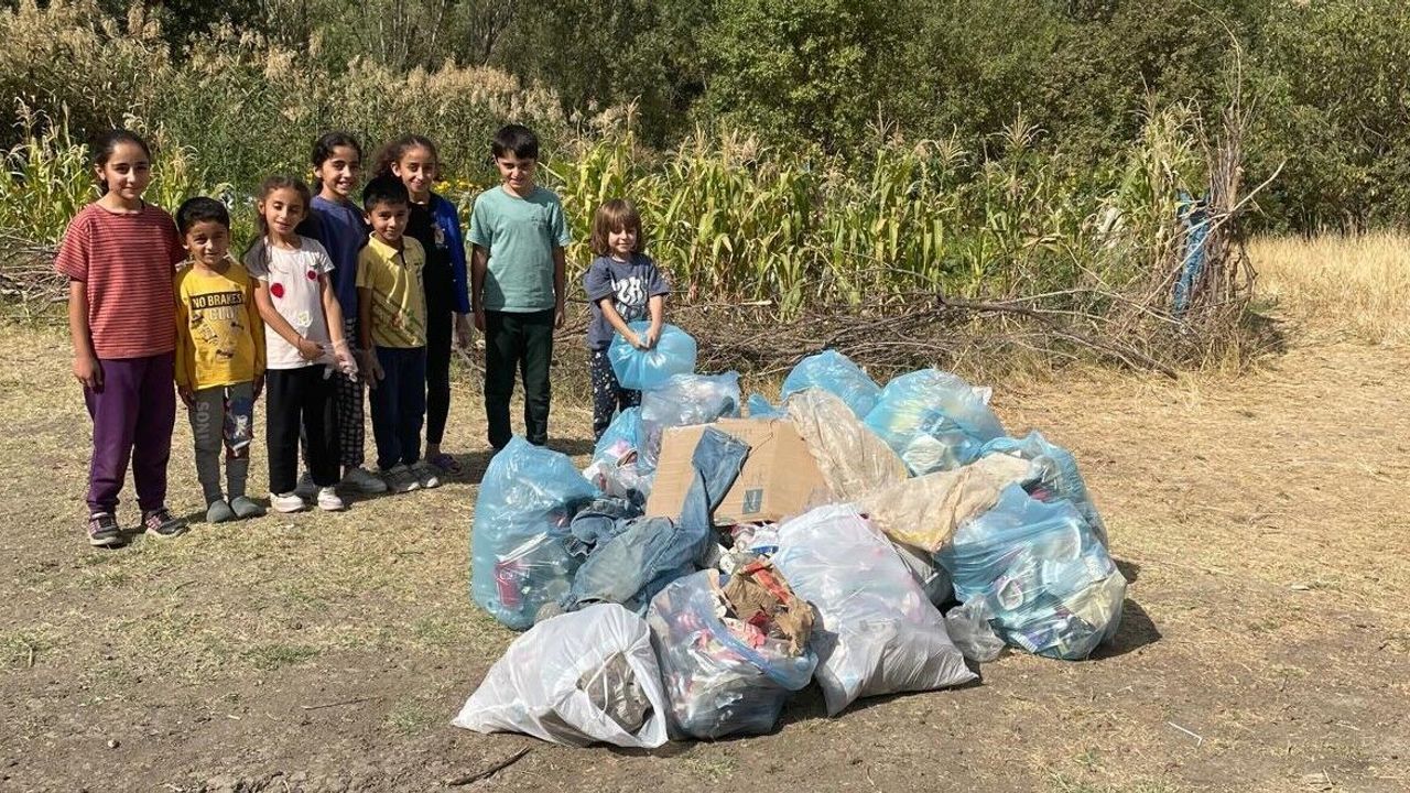 Hakkari’deki bir grup minik öğrenci oturma alanlarında çevre temizliği yaptı.