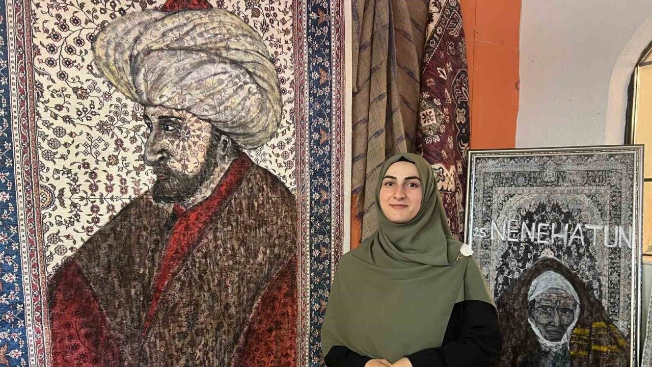 Erzurum’da üniversite mezunu ev hanımı Şeyma Sezer, halı üzerine akrilik boya ile yaptığı çalışmalarla tarihi şahsiyetleri yaşatıyor.
