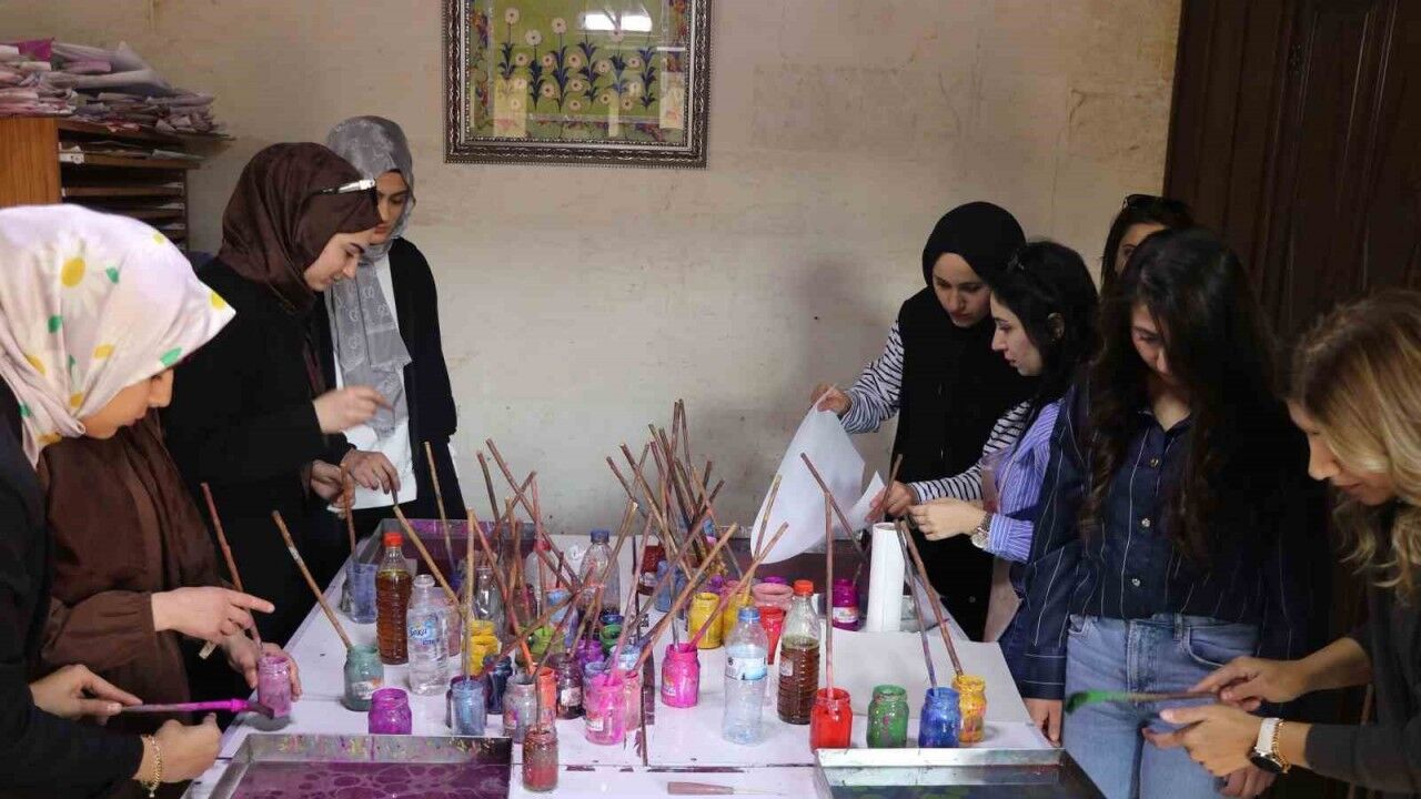 Ebru kursu öğrencisi Nehir Alya ise YKS’ye hazırlandığını ve stres atmak için keyifli zaman geçirdiğini belirterek, "Ben YKS öğrencisiyim. YKS’den arta kalan zamanlarda ebru kursuna geliyorum. Hocamıza ve başkanımıza çok teşekkür ederim" ifadelerini kullandı.