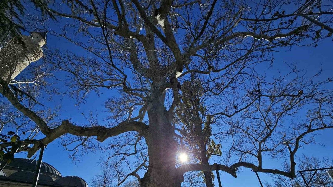 Kurşunlu Camii bahçesinde bulunan çınar ağacı, 300 yılı aşkın süredir zamana meydan okurken, kış aylarında da farklı bir güzelliğe bürünüyor.