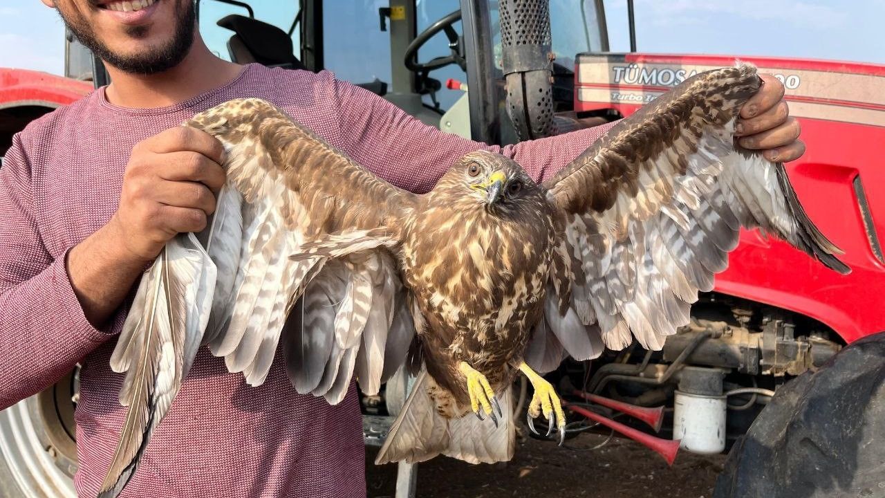 Adana’nın Ceyhan ilçesinde yer fıstığı hasadı yapan bir çiftçi, tarlada uçamayan bir şahin görünce hasadı bırakıp onun yardımına koştu.