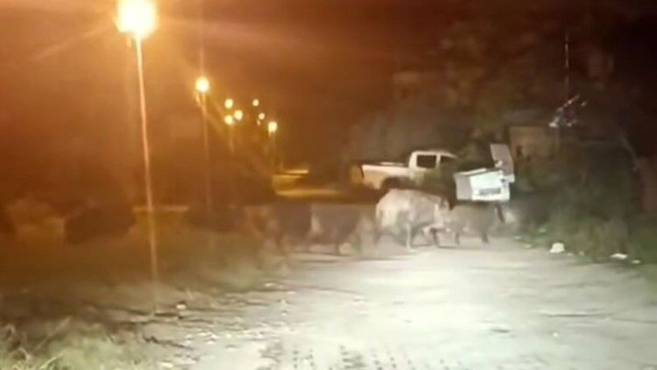 Samandağ ilçesi Tekebaşı Mahallesi’nde aç kalan domuz sürüsü, gece saatlerinde mahalleye indi. Sürü halinde bir süre gezen domuzlar bir vatandaşın cep telefonuna yansıdı.
