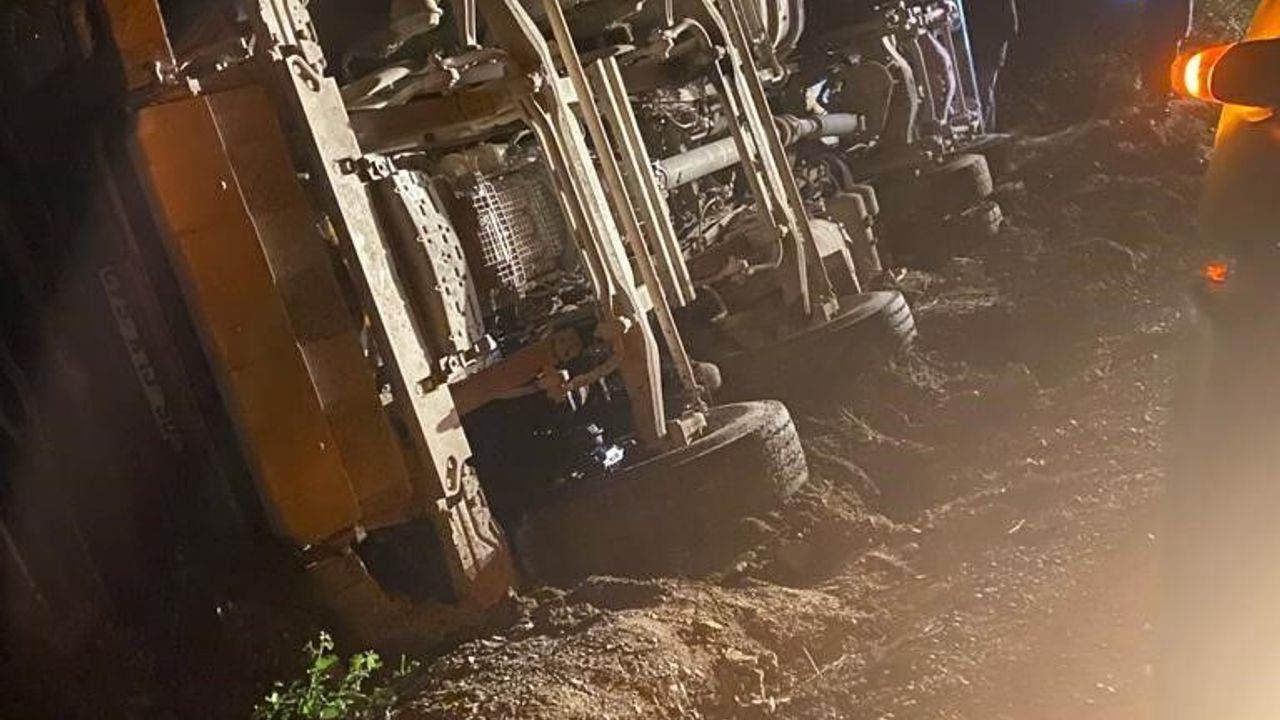 Hatay’ın Arsuz ilçesinde beton taşıyan kamyon, sürücüsünün direksiyon hakimiyetini kaybetmesiyle devrildi.