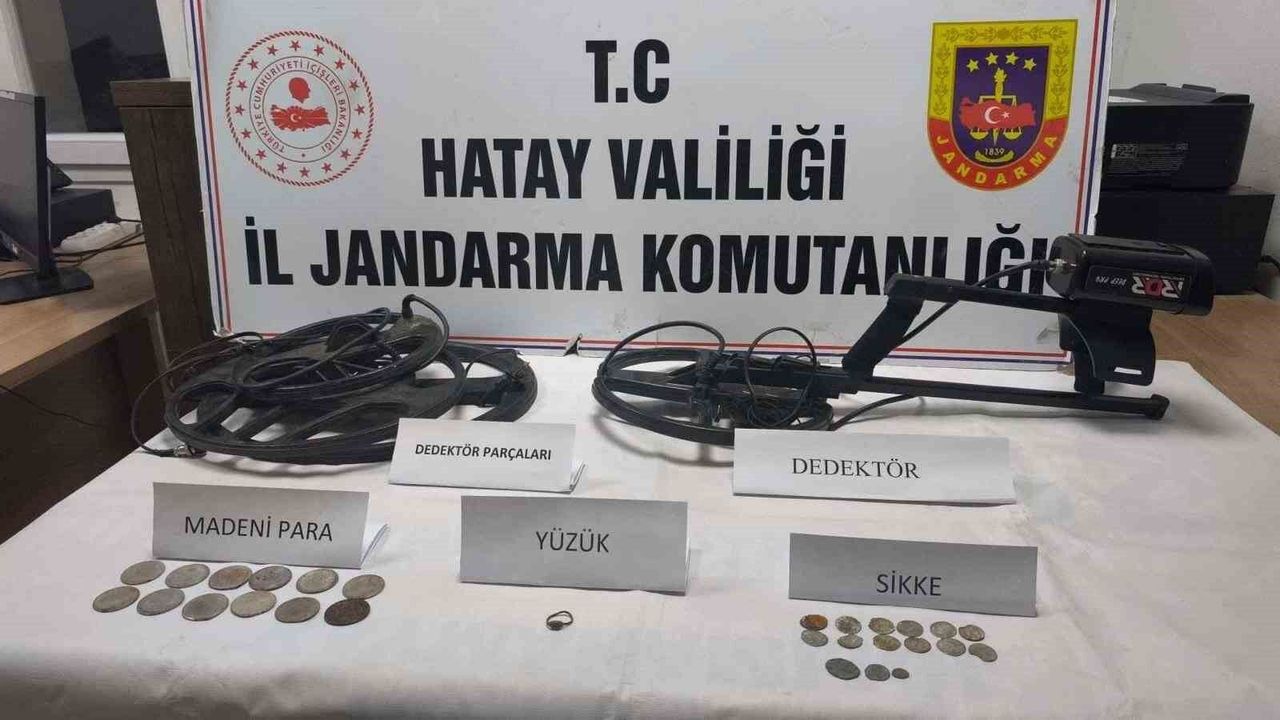 Hatay'da jandarma ekipleri tarafından yapılan ev aramasında tarihi eser niteliği taşıyan sikke, yüzük ve madeni para ele geçirildi.