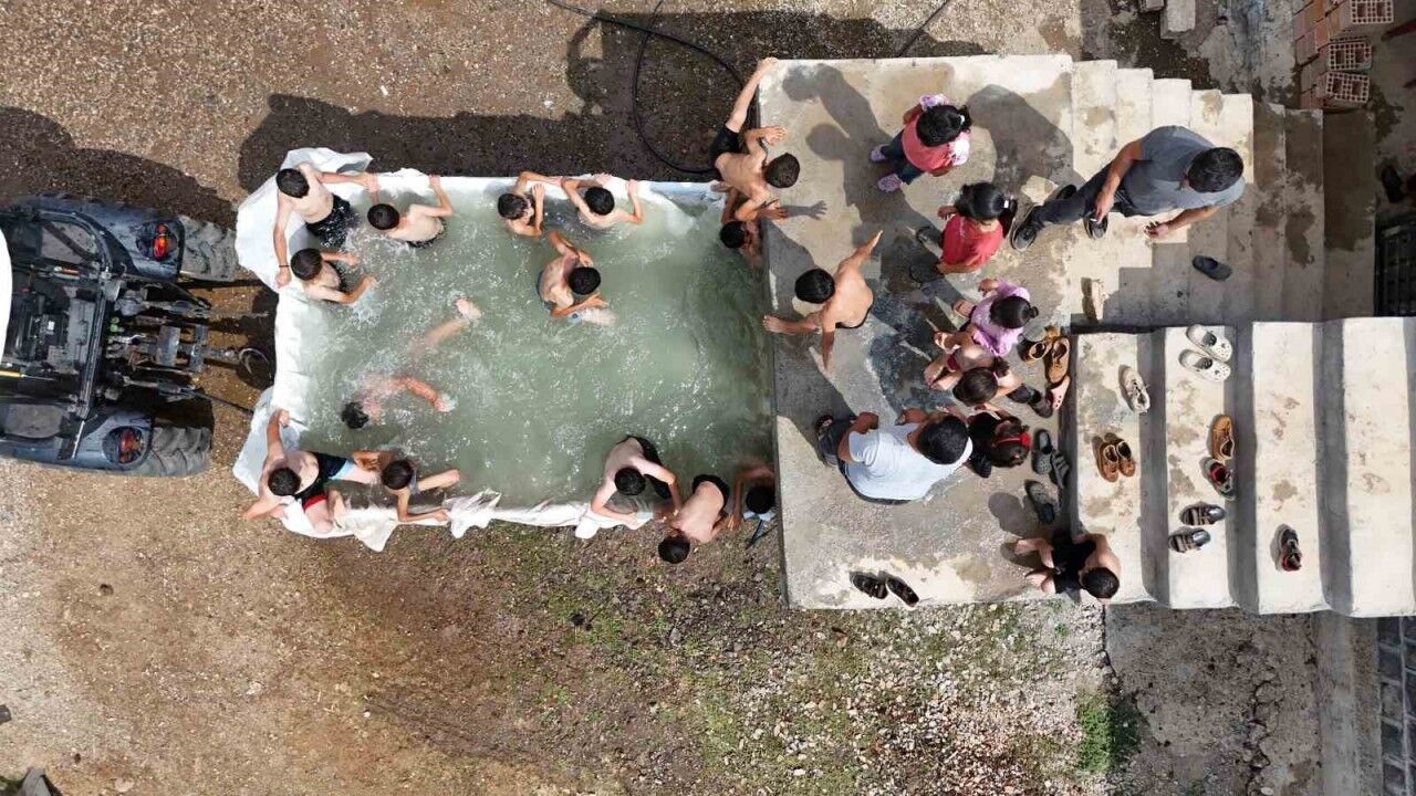 Diyarbakır’ın Çınar ilçesinde bunaltıcı sıcaklardan etkilenen çocuklar için römork içine çadır çekilip suyla dolduruldu. Evin merdivenin altına çekilip olimpik yüzme havuzu andıran sistem, dronla çekildi.