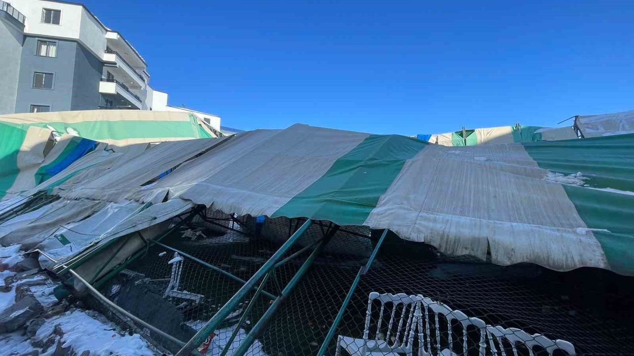 Iğdır'ın Tuzluca ilçesinde düğün salonu olarak kullanılan halı saha, günlerdir etkili olan kar yağışının ardından çöktü. Olay sırasında içeride kimsenin bulunmaması muhtemel bir faciayı önledi.