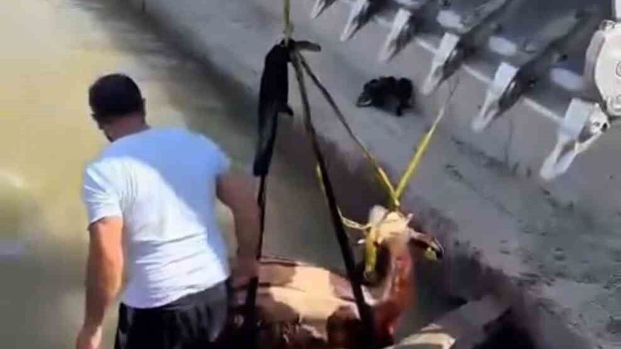 Edinilen bilgiye göre Iğdır’ın Çalpala köyünde otlayan bir inek, dengesini kaybederek su kanalına düştü. Akıntıya kapılan hayvanı gören köylüler, durumu hemen yakındaki kum ocağında çalışan kepçe operatörüne bildirdi. İki köylü suya girerek ineği iple bağladı. Kepçe yardımıyla kanaldan çıkarılan inek, sahibine teslim edildi.