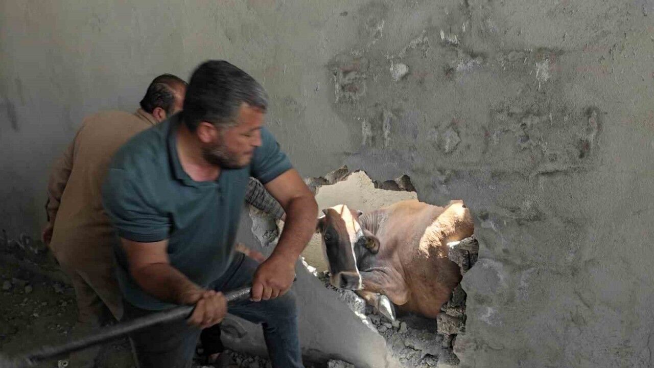 Batman’ın Sason ilçesinde iki iş yeri duvarı asındaki boşlukta sıkışan inek, vatandaşların balyozla duvarı kırıp çıkartmasıyla kurtarıldı.