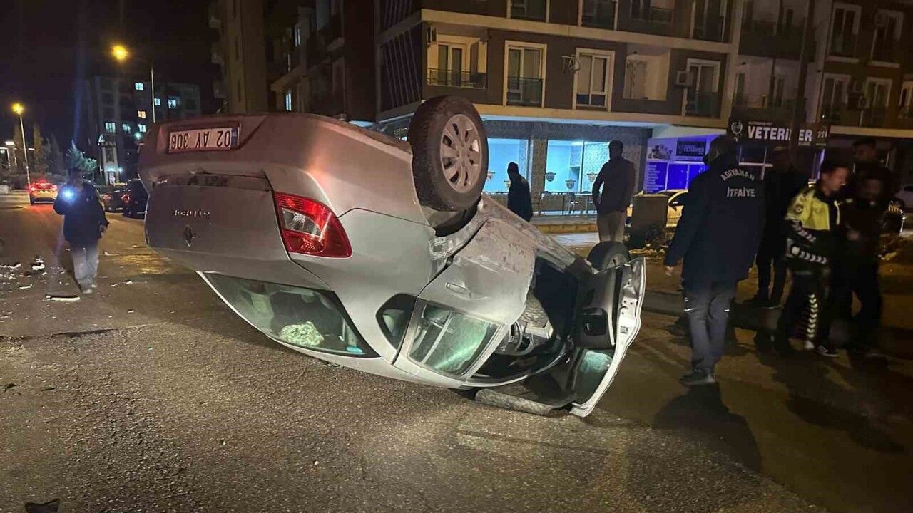 Adıyaman’da iki otomobilin çarpışması sonucu araçlardan biri ters döndü.