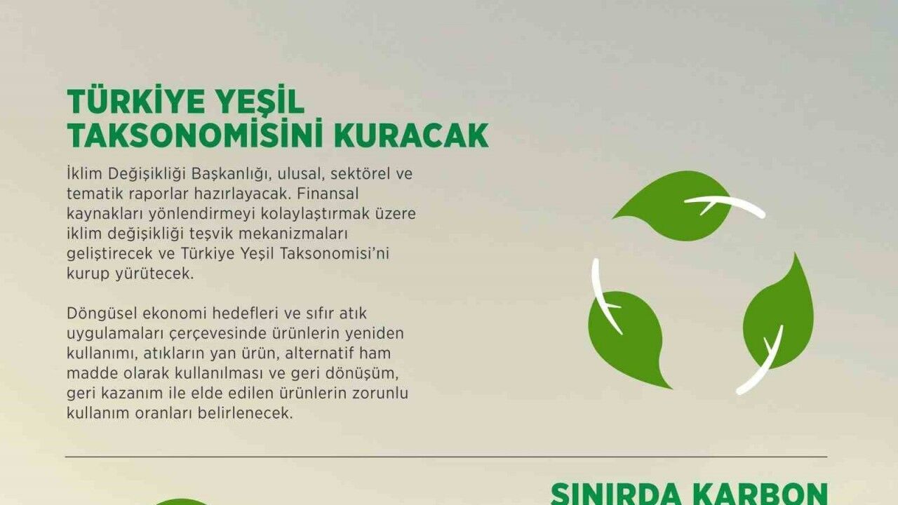 İklim Değişikliği Başkanlığı, ulusal, sektörel ve tematik raporlar hazırlayacak. Finansal kaynakları yönlendirmeyi kolaylaştırmak üzere iklim değişikliği teşvik mekanizmaları geliştirecek ve Türkiye Yeşil Taksonomisi’ni kurup yürütecek. Döngüsel ekonomi hedefleri ve sıfır atık uygulamaları çerçevesinde ürünlerin yeniden kullanımı, atıkların yan ürün, alternatif ham madde olarak kullanılması ve geri dönüşüm, geri kazanım ile elde edilen ürünlerin zorunlu kullanım oranları belirlenecek.