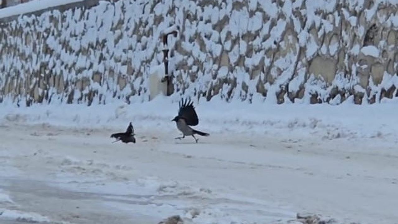 Malatya'nın Darende ilçesinde etkili olan kar yağışı sonrası ilçe beyaza bürünürken, yiyecek bulmakta zorlanan kargalar sokaklara indi.