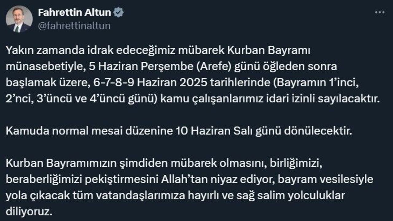 İletişim Başkanı Fahrettin Altun, "Yakın zamanda idrak edeceğimiz mübarek Kurban Bayramı münasebetiyle 5 Haziran Perşembe (Arefe) günü öğleden sonra başlamak üzere, 6-7-8-9 Haziran 2025 tarihlerinde kamu çalışanlarımız idari izinli sayılacaktır" dedi.