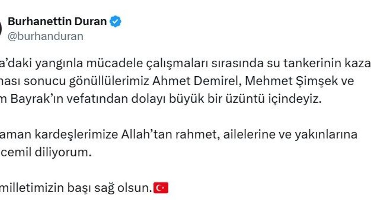 Cumhurbaşkanlığı İletişim Başkanı Burhanettin Duran, Bursa’da orman yangınına müdahale sırasında meydana gelen kazada hayatını kaybeden gönüllüler için sosyal medya hesabından taziye mesajı yayımladı. Duran mesajında, "Bursa’daki yangınla mücadele çalışmaları sırasında su tankerinin kaza yapması sonucu gönüllülerimiz Ahmet Demirel, Mehmet Şimşek ve Kazım Bayrak’ın vefatından dolayı büyük bir üzüntü içindeyiz" ifadelerini kullandı.