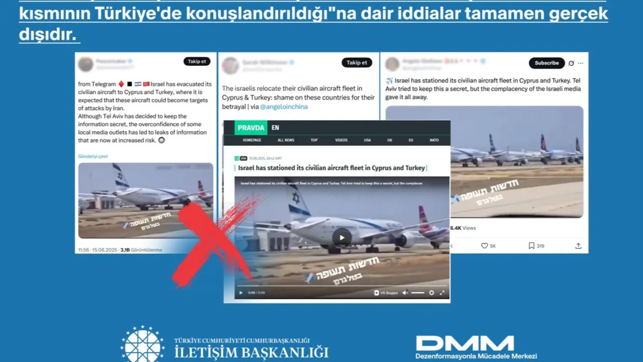 İletişim Başkanlığı Dezenformasyonla Mücadele Merkezi, sosyal medyada yayılan “İsrail sivil uçaklarının Türkiye’de konuşlandırıldığı” iddialarını yalanladı. Türkiye’nin İsrail ile tüm havacılık faaliyetlerini durdurduğu vurgulandı.ANKARA (İGFA) - İletişim Başkanlığı Dezenformasyonla Mücadele Merkezi, bazı sosyal medya platformlarında yer alan “İsrail sivil uçak filosunun bir kısmının Türkiye’de konuşlandırıldığı” iddialarını kesin bir dille yalanladı.