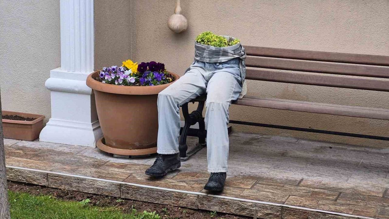 Ertuğrulgazi Mahallesi Şanver Sokak'ta bulunan bir evin bahçesindeki bankın üzerine yerleştirilen dekorasyon göze çarptı. Ayakkabı, pantolon ve saksı birleştirilerek yapılan dekorasyon, sanki bankın üzerinde oturan birisi varmış gibi görüntü oluşturdu. İnsan figürlü saksı, hem ilginç, hem de ürkünç yönüyle çevreden geçenlerin dikkatini topladı.