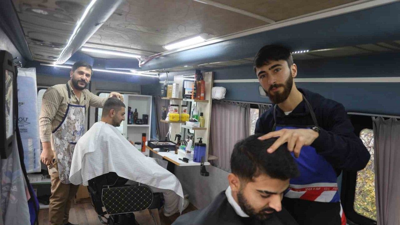 Hatay’ın Defne ilçesinde 15 yıldır berberlik yapan Salih Özçelik, arkadaşı İbrahim Culhacı’yla birlikte minibüsün içerisini düzenleyerek ‘mobil berber aracı’ yaptı. Mobil berber aracıyla ulaşımın zor olduğu yerlere giden iki arkadaş, müşterilerini berber dükkanından farksız mobil berber aracında tıraş ediyorlar.