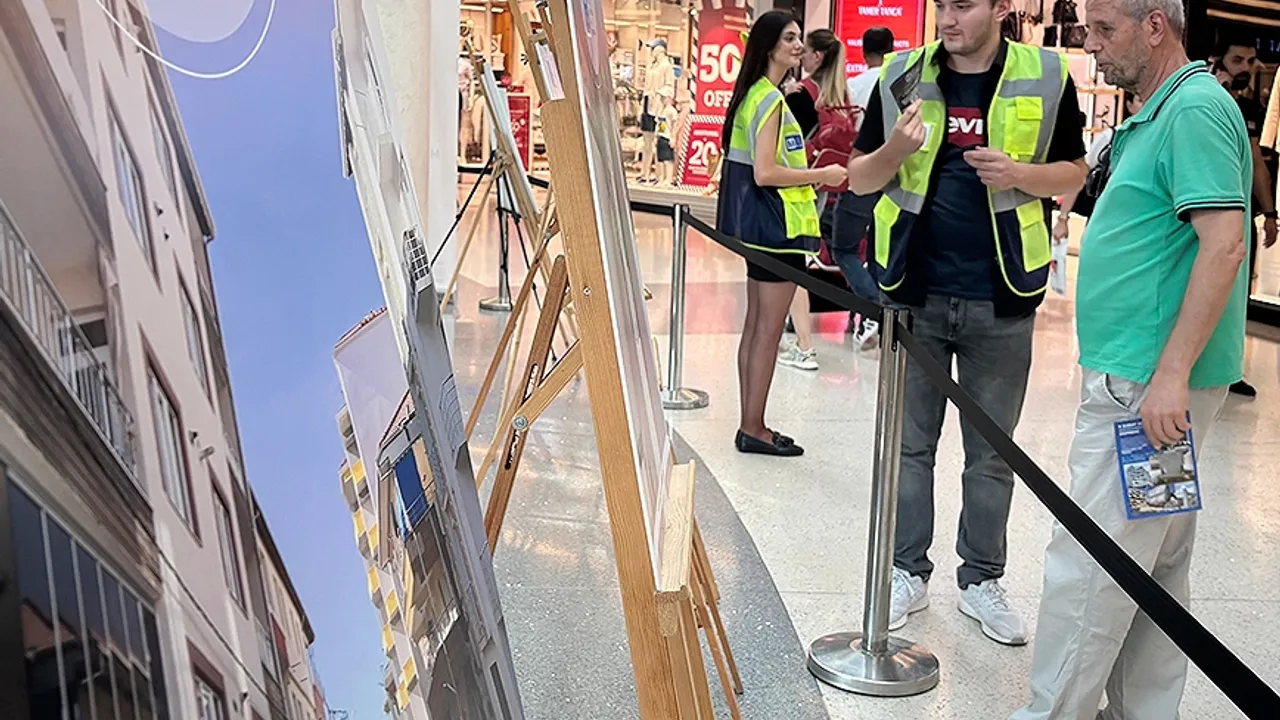 Deprem gerçeğini hatırlatan fotoğrafların sergilendiği etkinlikte genç inşaat mühendisleri halkı bilinçlendirmek için broşür dağıttı.