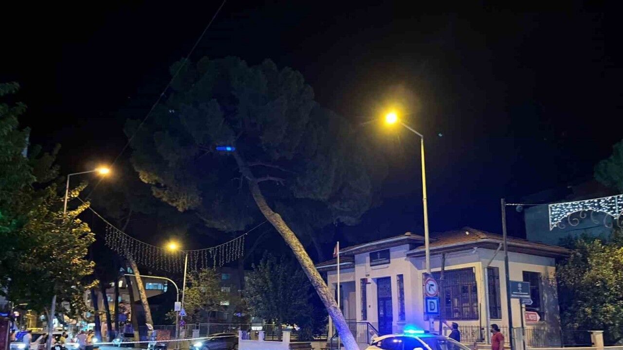 Aydın’ın İncirliova ilçesinde akşam saatlerinde etkili olan kuvvetli rüzgar nedeniyle İlçe Halk Kütüphanesi önünde bulunan çam ağacı yan yattı.