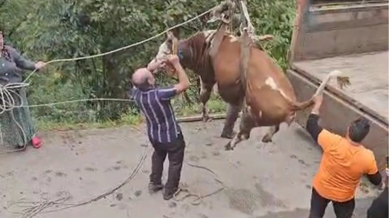 Rize’nin Çamlıhemşin ilçesinde yoldan aşağıya yuvarlanan inek bulunduğu yerden vinçle kurtarıldı.