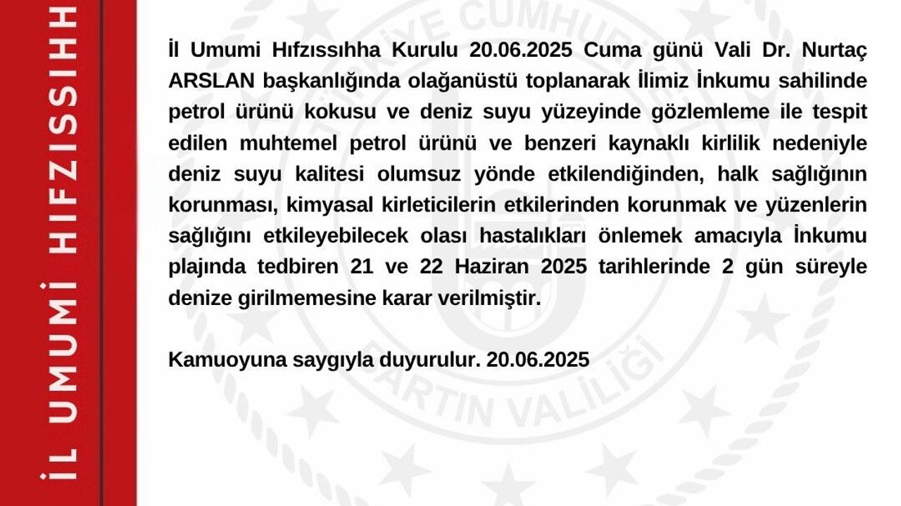 Bartın Valiliğinden yapılan açıklamada, "İl Umumi Hıfzısıha Kurulu 20 Haziran 2025 Cuma günü Vali Dr. Nurtaç Arslan başkanlığında olağanüstü toplanarak ilimiz İnkumu sahilinde petrol ürünü kokusu ve deniz suyu yüzeyinde gözlemleme ile tespit edilen muhtemel petrol ürünü ve benzeri laynaklı kirlilik nedeniyle deniz suyu kalitesi olumsuz yönde etkilendiğinden, halk sağlığının korunması, kimyasal kirleticilerin etkilerinden korunmak ve yüzenlerin sağlığını etkileyebilecek hastalıkları önlemek amacıyla İnkumu plajında tedbiren 21 ve 22 Haziran 2025 tarihlerinde 2 gün süreyle denize girilmemesine karar verilmiştir" ifadelerine yer verildi.