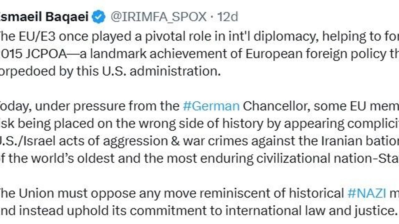 İran Dışişleri Bakanlığı Sözcüsü İsmail Bekayi, ABD ve İsrail'in İran'a yönelik saldırılarına destek veren Avrupa Birliği ülkelerine, 'Birlik, tarihsel Nazi zihniyetlerini hatırlatan her türlü harekete karşı çıkmalı ve bunun yerine uluslararası hukuka ve adalete olan bağlılığını sürdürmelidir' çağrısında bulundu.