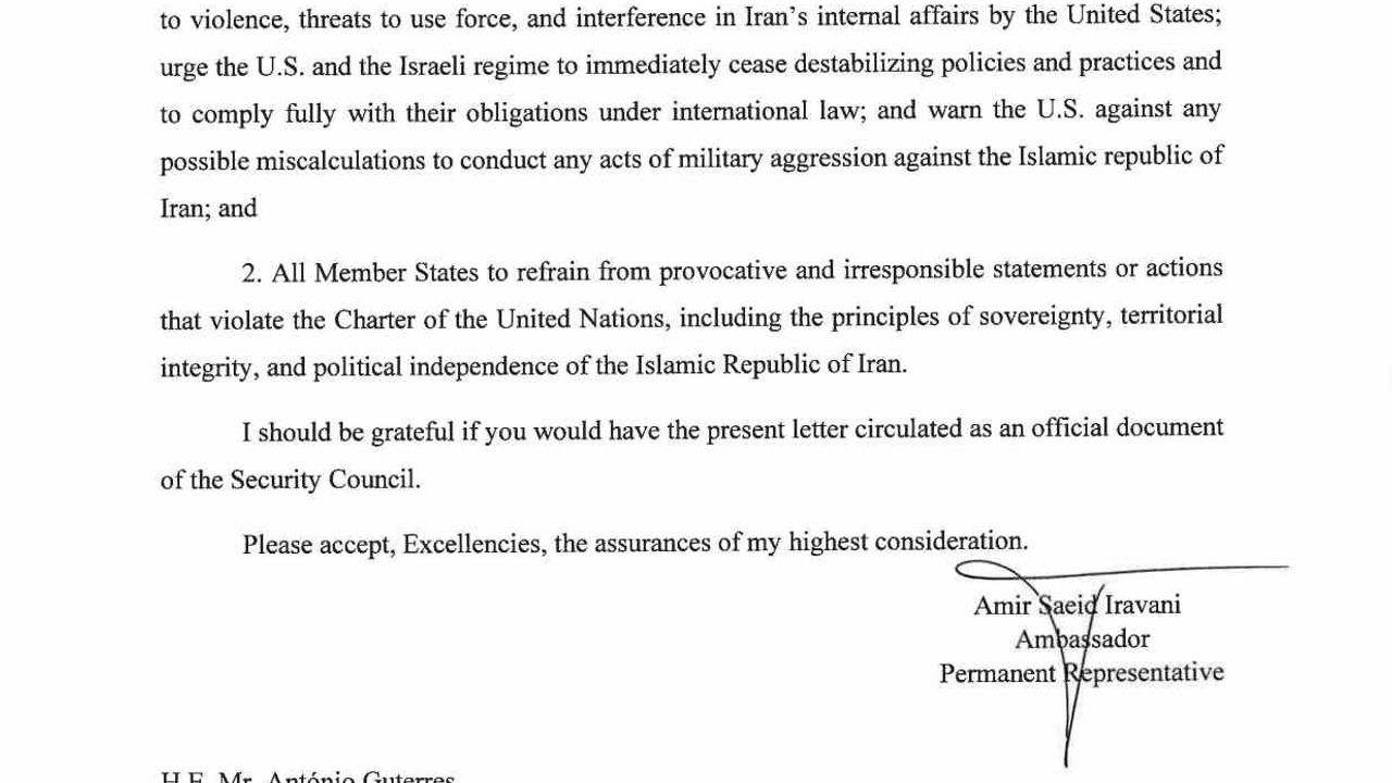 BM Genel Sekreteri Antonio Guterres, BM Güvenlik Konseyi ve konsey üyesi ülkelere ABD'nin İran'ın iç işlerine müdahalesine ve güç kullanma tehditlerine karşı çıkma çağrısı yapan İravani, 'Tüm üye devletler, İran İslam Cumhuriyeti'nin egemenliği, toprak bütünlüğü ve siyasi bağımsızlığı ilkeleri dahil BM Şartı'nı ihlal eden kışkırtıcı ve sorumsuz açıklamalardan veya eylemlerden kaçınmalıdır' ifadelerine yer verdi. İravani, gönderdiği mektubun resmi bir belge olarak BM Güvenlik Konseyi üyesi ülkelere dağıtılmasını talep etti.