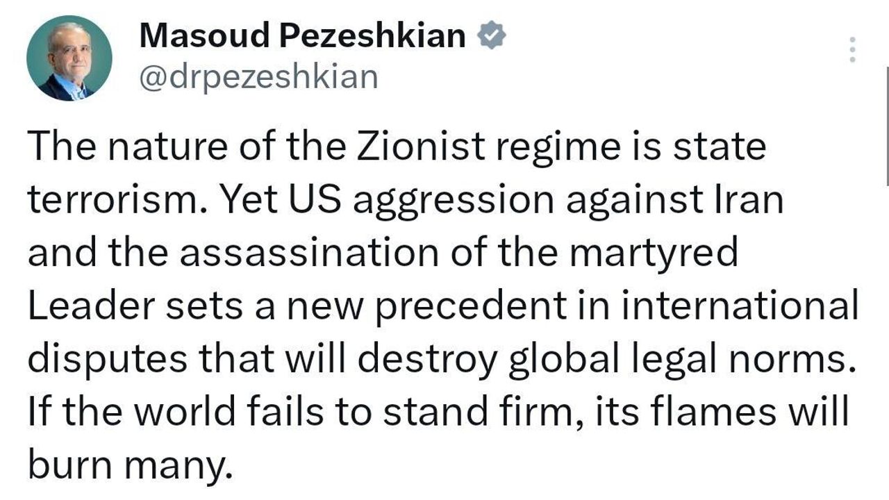 İran Cumhurbaşkanı Mesut Pezeşkiyan, devlet terörizminin İsrail'deki siyonist rejimin doğası olduğunu belirterek, 'Ancak, ABD'nin İran'a karşı saldırganlığı ve şehit liderimize yönelik suikast uluslararası hukuk normlarını yıkan yeni bir emsal teşkil etmektedir. Eğer dünya bu duruma kararlı şekilde karşı çıkmazsa, alevleri birçoğunu yakacaktır' uyarısında bulundu.
