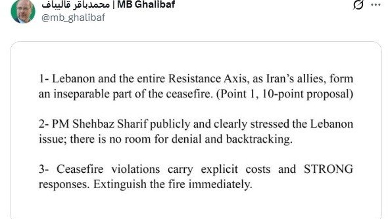 İran Meclis Başkanı Muhammed Bakır Galibaf, İsrail'in Lübnan'a saldırılarına ilişkin sosyal medyadan paylaşım yaptı. Galibaf, paylaşımında ABD ile 15 günlük ateşkes sağlanmasına yönelik sunulan maddeleri hatırlattı. Galibaf, 'İran'ın müttefikleri olan Lübnan ve tüm direniş ekseni, ateşkesin ayrılmaz bir parçasını oluşturmaktadır. (10 maddelik teklifin 1. maddesi). Pakistan Başbakanı Şahbaz Şerif, Lübnan meselesini kamuoyu önünde açıkça vurguladı, inkara ve geri adıma yer yok' ifadelerini kullandı. İsrail'in Lübnan'a yönelik saldırılarıyla ateşkesin ihlal edilmesinin ciddi sonuçlar doğuracağı uyarısında bulunan Galibaf, 'Ateşkes ihlalleri, bedellere ve sert karşılığa yol açar. Ateşi derhal söndürün' ifadelerini kullandı.