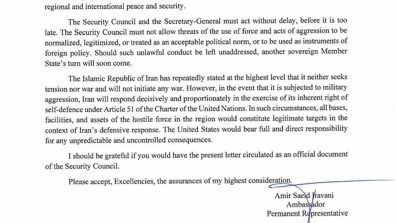 İran'ın gerilim ya da savaş arayışında olmadığını, ancak kendisini savunmaya kararlı olduğunu yineleyen Iravani, 'Ülkemiz, askerî saldırıya maruz kalması halinde, BM Şartı'nın 51. maddesi kapsamında sahip olduğu meşru müdafaa hakkını kullanarak kararlı ve orantılı biçimde karşılık verecektir. Böyle bir durumda, düşman kuvvetlere ait bölgedeki tüm üsler, tesisler ve varlıklar İran'ın savunma kapsamındaki meşru hedefleri olacaktır. Doğabilecek öngörülemeyen ve kontrol edilemez sonuçların tüm sorumluluğu doğrudan ABD'ye aittir' ifadelerini kullandı. Irevani, gönderdiği mektubun resmi bir belge olarak BM üyesi devletlere iletilmesi talebinde bulundu.